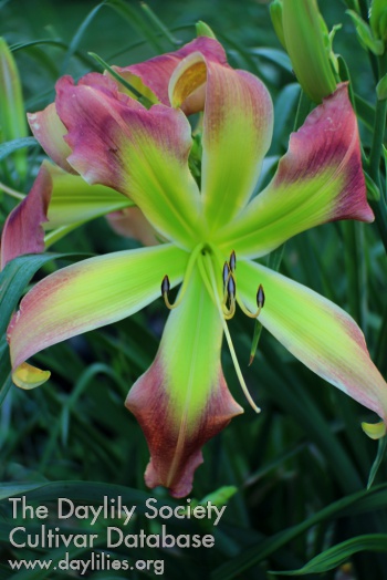 Adventures in Oz (Herrington-H., 2014) DF Diploid, Evergreen, Early to mid-season w/Rebloom. 25 buds, 5 branches. 28″ scape height, 8″ bloom size. Unusual Form Cascade. Color: Lavender rose pink with darker mauve rose eye, very large green throat, and lighter midribs on petals. Parentage: (Pink Haired Lady x sdlg)