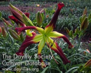 Artillery Fire (Waldrop, 2015) DF Tetraploid, Semi-evergreen, Early to mid-season w/Rebloom. 44″ scape height, 12″ bloom size. 23 buds, 4 branches. Unusual Form Crispate. Color: Bold burgundy with a large and distinctive green eye that extends into the petals and sepals, twisted crispate form on the petals and sepals. Parentage: (Wild and Free × Walt Lowry) Awards: HM 2023