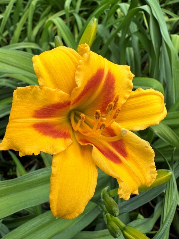 Radiant yellow with orangish red sunburst band intersected by yellow midribs. Named in memory of my Mother-in-Law, Sharon Sabo. We are a state licensed and inspected nursery. Plants are guaranteed true to name. Shipping is $12 for the first plant and an additional $2 for each additional item.